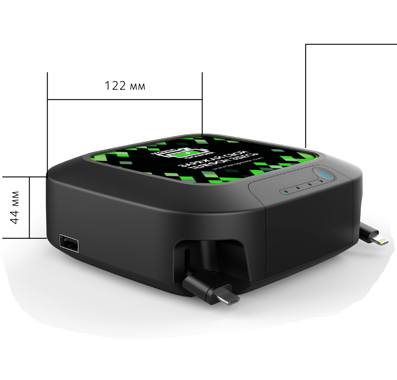 Современное, компактное, настольное зарядное устройство Bang QI. Удобно в использовании за счёт беспроводной зарядки, 2-х выдвижных кабелей, и USB-порту, благодаря которым можно заряжать сразу до 4-х устройств. Bang QI также имеет сменный рекламный стенд, что позволяет компаниям менять рекламную брошюру хоть каждый день.