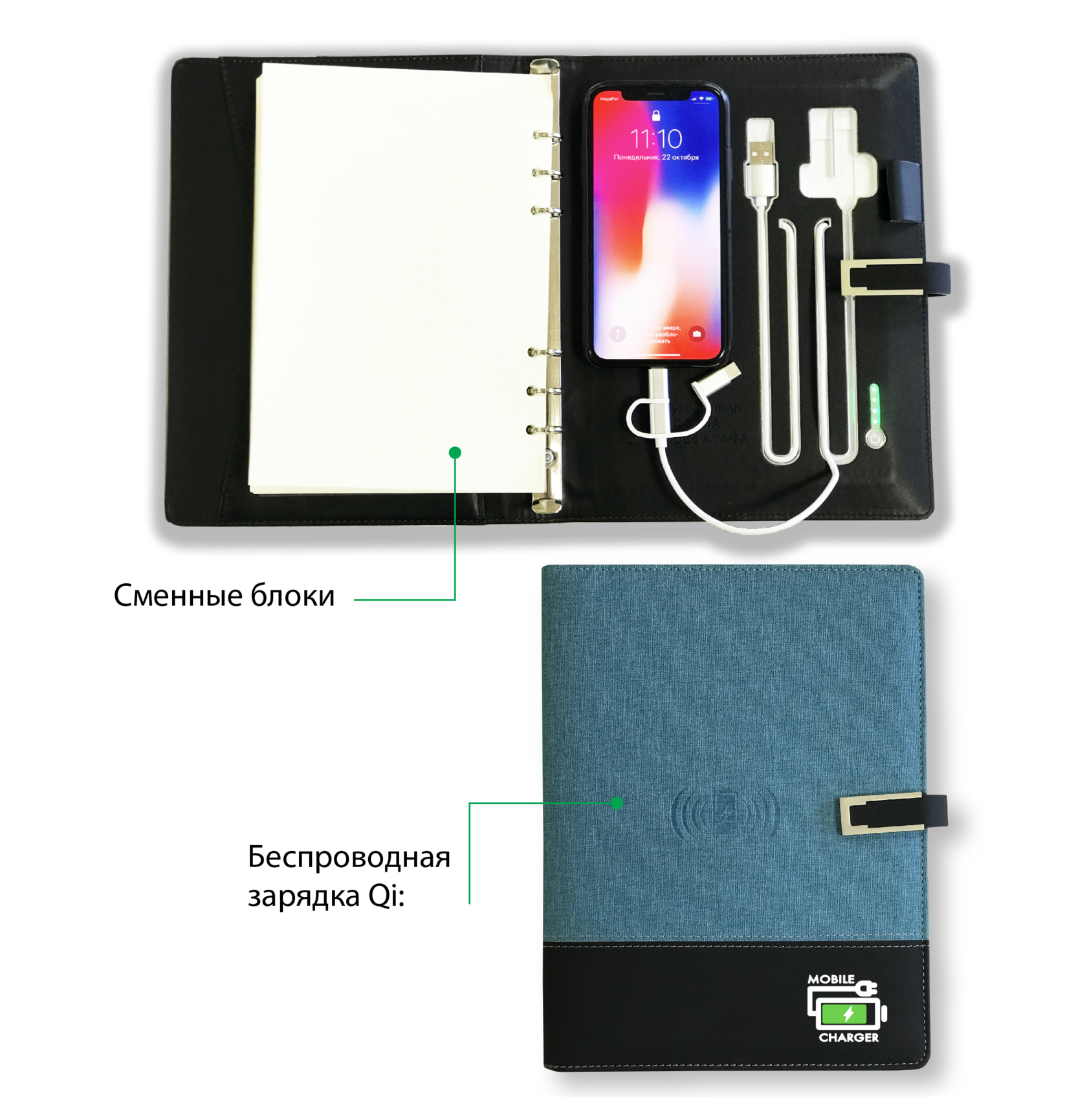 Daily - это ежедневник или блокнот со встроенными провода и беспроводной зарядкой. Блокнот содержит сменные блоки, беспроводную зарядку, встроенную флешку, а также сертифицированные провода: USB, Micro USB, Type C, Lightning. Объем батареи составляет 8000 mAh. Блокнот Daily представлен в 3 – х цветах: голубой, розовый и серый.