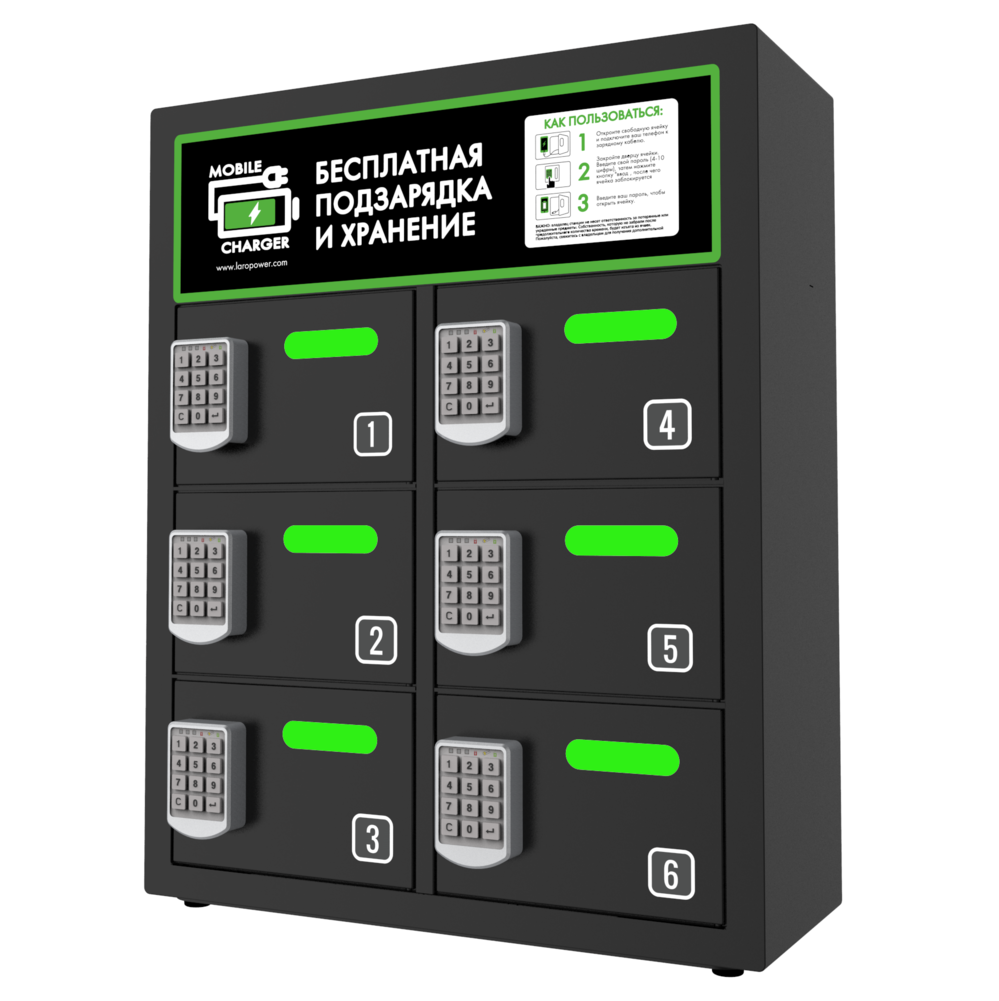 Зарядная станция Defender выполнен из прочного металла, имеет 6 ячеек для подзарядки и хранения с пин-кодом, сменные кабели, поверхность полностью брендируемая, а также может заряжать одновременно до 12 гаджетов. Defender можно разместить как на стене, так и на стойке.