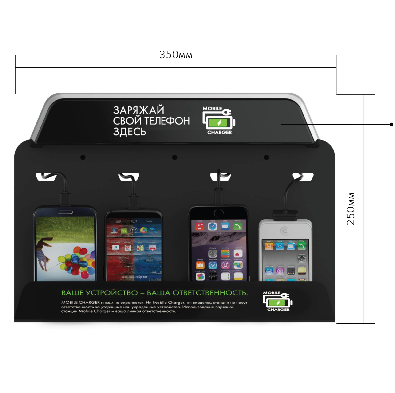 Настенное зарядное устройство Malevich. Удобен и прост в использовании, имеет LED подсветку, а также 4 сертифицированных зарядных кабеля. Зарядное устройство Malevich можно разместить как на стене, так и на стойке, тем самым можно не делать отверстия в стене. Malevich оснащен удобным карманом для гаджетов на время подзарядки, вся поверхность брендируется. Все провода сменные, что упрощает вопрос обслуживания устройства.