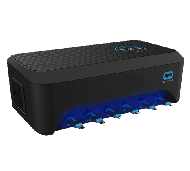 Настольное зарядное устройство Megapolis имеет 6 выдвижных проводов, беспроводную зарядку QI, может заряжать до 7 гаджетов одновременно. Megapolis оснащен универсальной розеткой, имеет более 10 цветовых режимов подсветки и бесконтактное управление.