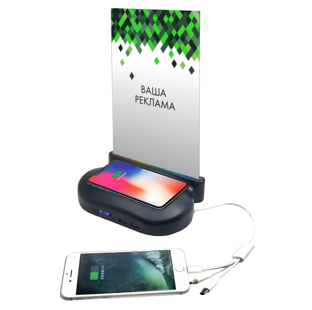 Зарядное устройство Promic QI или Тейбл - Тент идеальное решение для подзарядки на каждом столе. Оно может заряжать до 6-х гаджетов одновременно, уровня заряда хватает на 1-2 дня, есть возможность размещать рекламные объявления, имеет беспроводную зарядку QI, функцию «быструю подзарядку», а также можно оснастить системой от воровства.