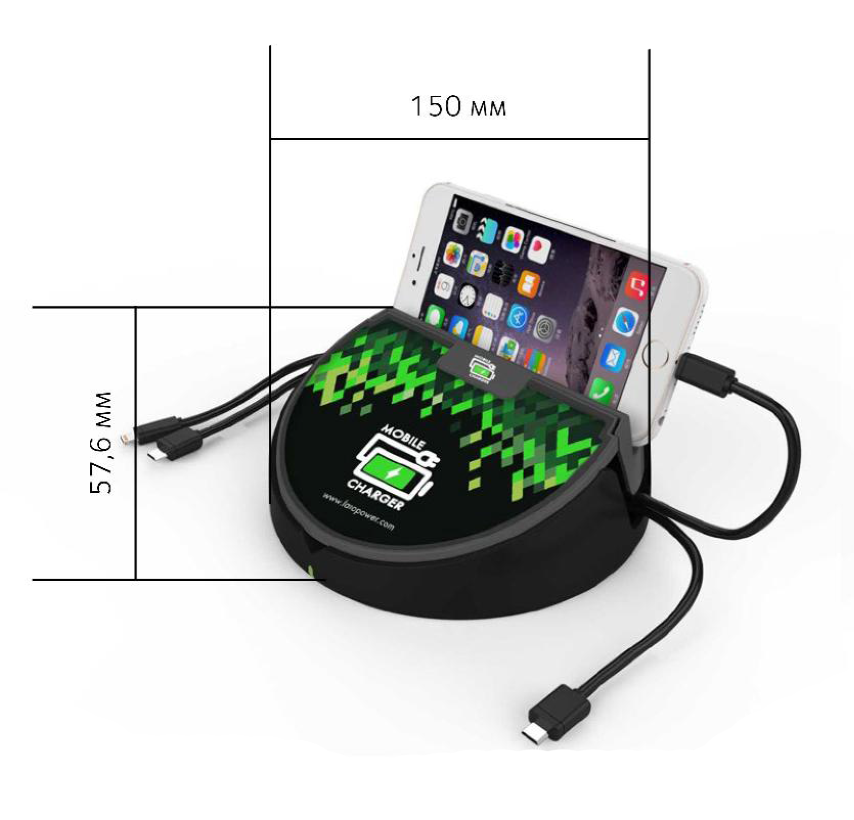 Поверхность полностью брендируется, имеется специальный карман для проводов, куда они с легкостью складываются. Можно зарядить одновременно 4 гаджета, все провода в оплетке, благодаря чему они служат дольше.