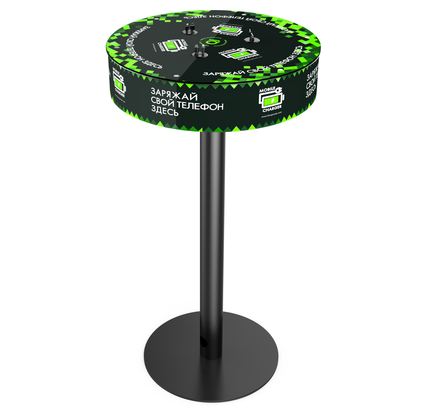 Зарядное устройство – стол SOHO обладает беспроводной зарядкой QI, столешница состоит из прочного органического стекла, её поверхность полностью брендируется. В стол встроены сменные выдвижные провода: Apple MFI, Type-C, а также есть водонепроницаемая защита для проводов и QI зарядки. В комплекте идет металлическая стойка черного цвета. Это единственное подобное решение в своём роде.
