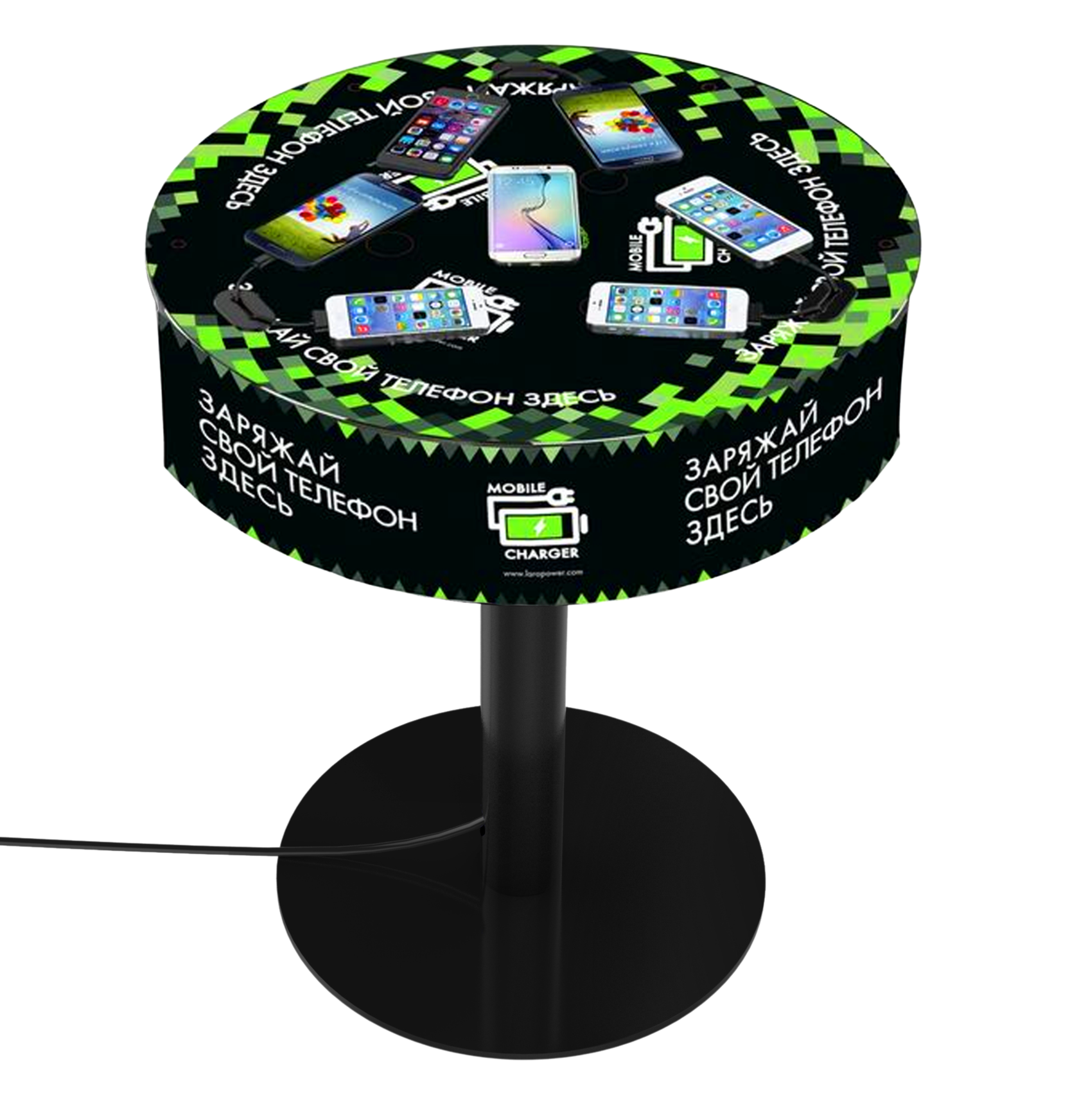 Зарядное устройство – стол SOHO обладает беспроводной зарядкой QI, столешница состоит из прочного органического стекла, её поверхность полностью брендируется. В стол встроены сменные выдвижные провода: Apple MFI, Type-C, а также есть водонепроницаемая защита для проводов и QI зарядки. В комплекте идет металлическая стойка черного цвета. Это единственное подобное решение в своём роде.