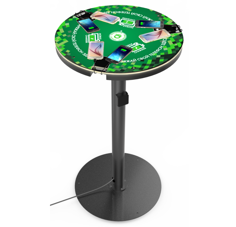 Зарядное устройство – стол SOHO обладает беспроводной зарядкой QI, столешница состоит из прочного органического стекла, которая оснащена LED панелью, её поверхность полностью брендируется. В стол встроены сменные выдвижные провода в оплётке: Apple MFI, Type-C, Micro USB, а также есть водонепроницаемая защита для проводов и QI зарядки. В комплекте идет металлическая стойка черного цвета, которая оснащена розеткой. Это единственное подобное решение в своём роде.