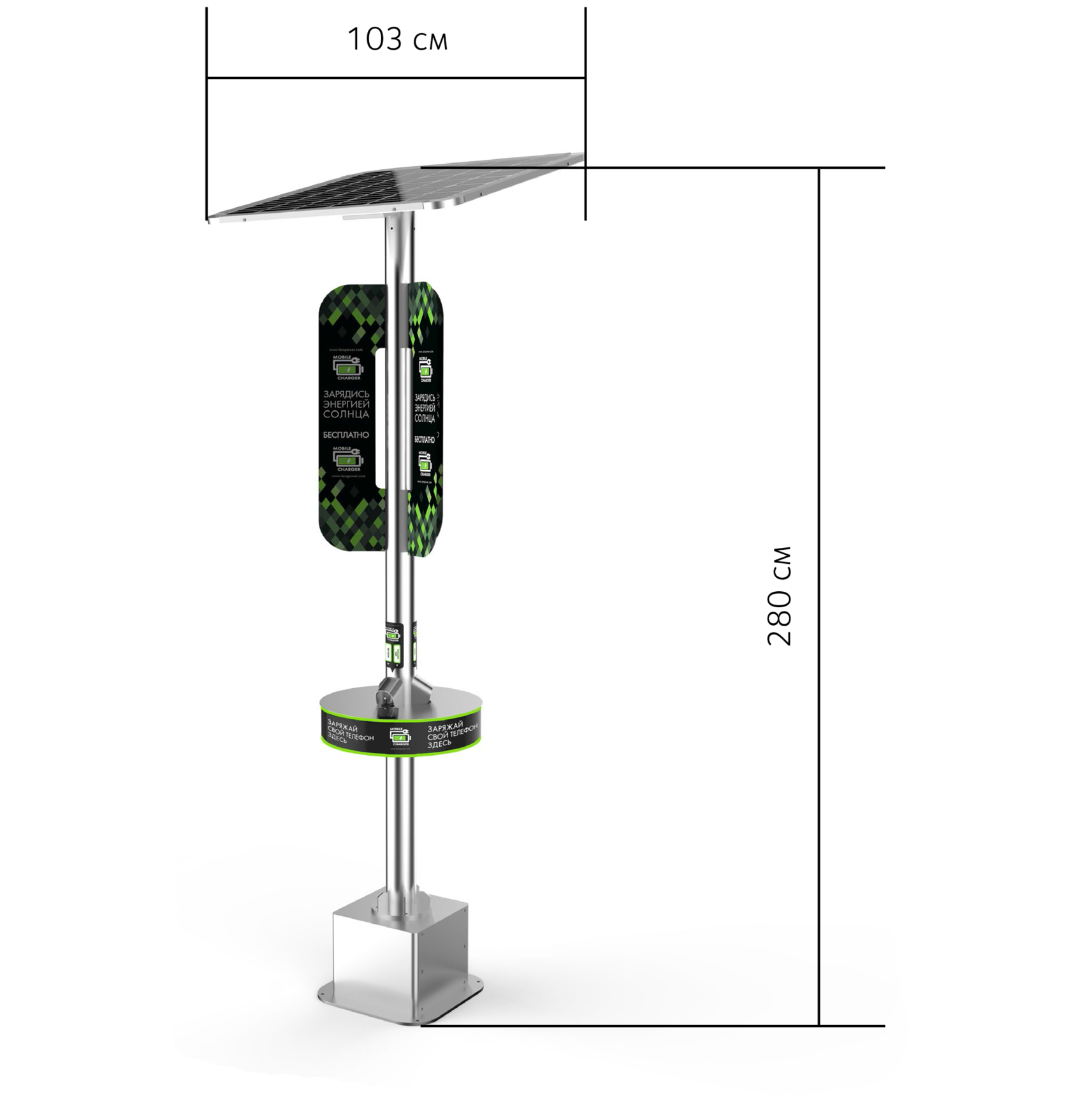 Зарядная станция на солнечной батарее Stark может заряжать более 40 гаджетов от 0 до 100%. Одновременно можно заряжать до 6 гаджетов, имеет сменную рекламную и брендированную поверхность. Также имеет возможность организовывать Wi-Fi доступ.