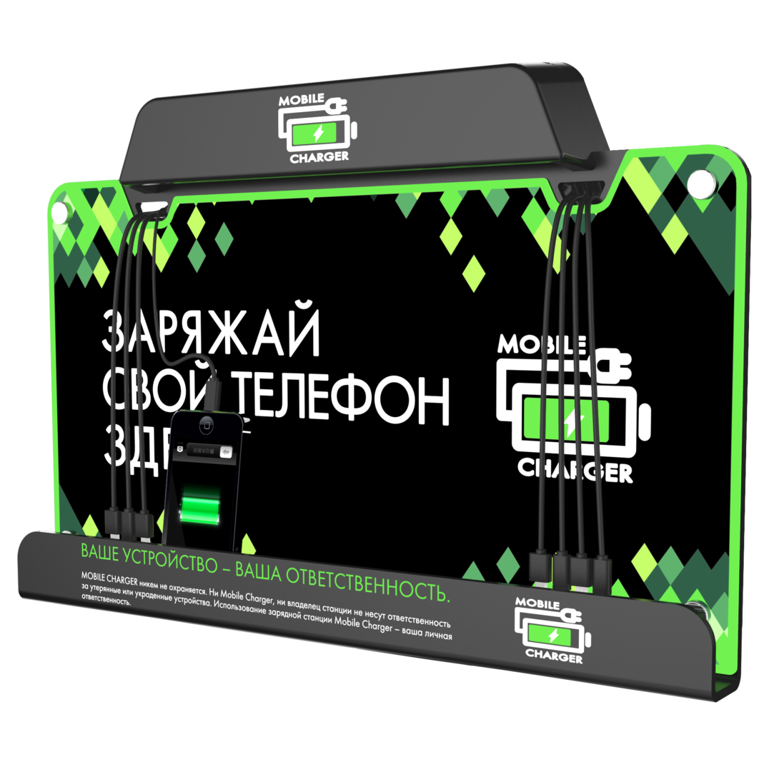 Настенная зарядная станция Traffic, внешне похожа на другие настенные зарядные устройства, но небольшие отличия всё-таки есть. В станцию встроены 8 сертифицированных зарядных кабелей в оплётке, имеет LED подсветку, вся поверхность брендируемая, а также имеет сменную рекламную площадку.